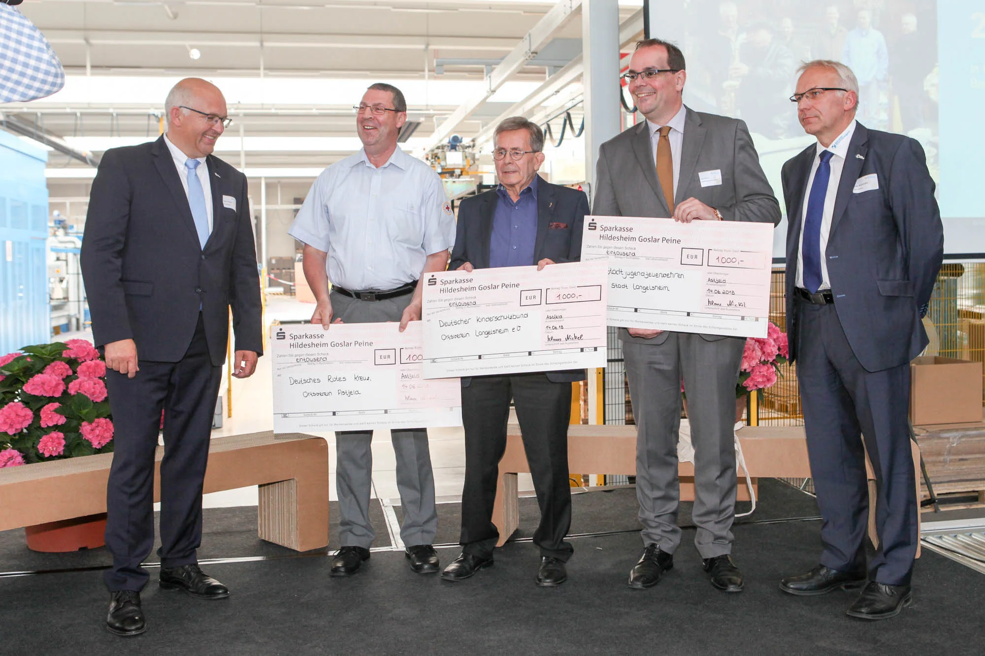 Die Feierlichkeiten zum 65. Geburtstag der Harzer Kartonagenfabrik nahm das Unternehmen zum Anlass, die Gäste um Spenden statt Geschenke zu bitten. Die rund 100 Geschäftspartner und Kunden ließen sich nicht lumpen und spendeten insgesamt 3.000 Euro. Das Geld ging zu gleichen Teilen an die Langelsheimer Jugendfeuerwehr, den Kinderschutzbund Langelsheim und das Astfelder Deutsche Rote Kreuz, deren Vertreter noch während der Veranstaltung symbolische Schecks entgegennehmen konnten.