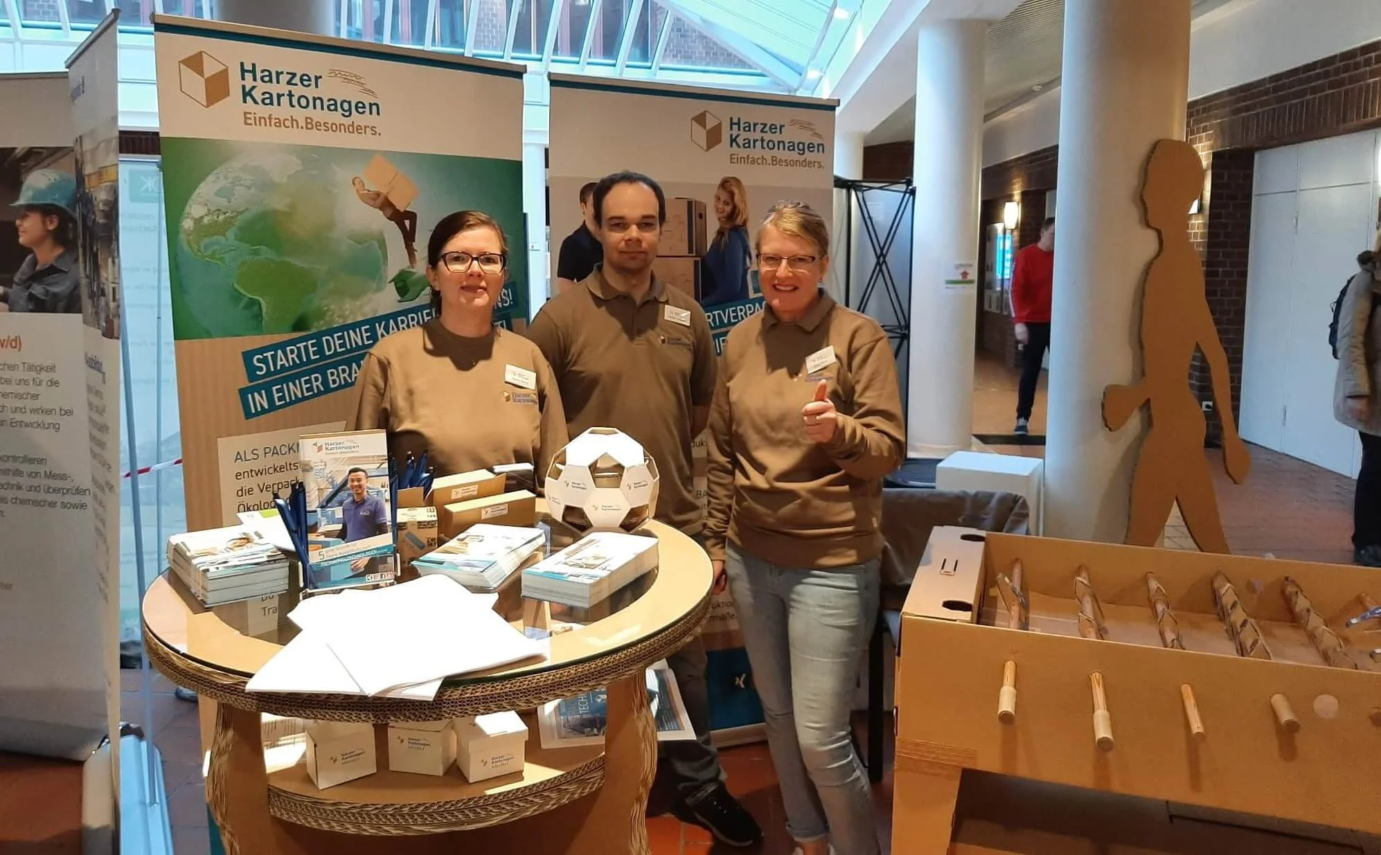 Am Messestand des Langelsheimer Traditionsunternehmens herrschte reges Treiben. Schnell hatte sich bei den Schülern herumgesprochen, dass ein Kicker aus Wellpappe anwesend war. Doch nicht nur der Kickertisch zog die Jugendlichen an, auch die interessanten Ausbildungsberufe bei Harzer Kartonagen. „Ob Packmitteltechnologe/in, Fachkraft für Lagerlogistik, Maschinen- und Anlagenführer/in oder Industriekaufmann/-frau, da ist für jeden etwas dabei“, freut sich Gina Silwar, Personalverantwortliche bei Harzer Kartonagen. Und Nancy Stock ergänzt: „Nach zwei Jahren coronabedingter Pause hat es großen Spaß gemacht, live mit Schülern und Lehrern ins Gespräch zu kommen.“