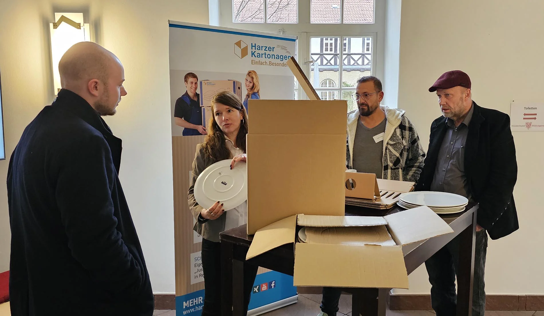 Diese Lösungen stellten Uwe Borsutzky und seine Kollegin Nancy Stock auch am Montag im Kreuzgang des Klosters vor. Oberstes Ziel: die Sicherheit des Produktes. „Unsere Kunden möchten, dass ihre Produkte sicher von A nach B kommen. Die Verpackung muss das Produkt maximal schützen, gleichzeitig aber auch Ressourcen schonen“, erklärt Borsutzky im Interview mit Sat1Regional. Die bei Harzer Kartonagen entwickelten nachhaltigen Verpackungen aus Wellpappe und Holz erfüllen genau diese Anforderungen, wie Nancy Stock und Uwe Borsutzky am Beispiel einer Tellerverpackung präsentierten.