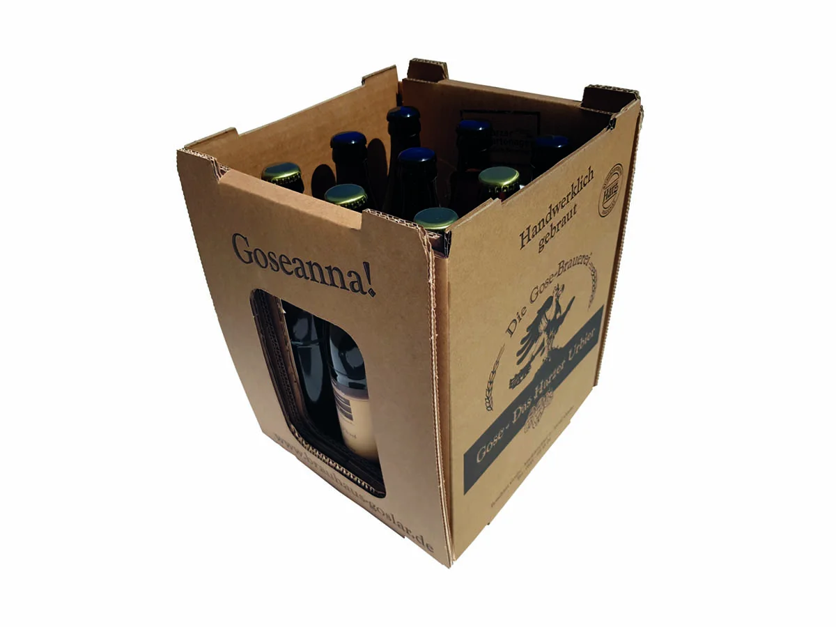 Der Kunde hatte bereits einen Vorschlag. Die angedachte Verpackung aus Wellpappe musste allerdings geklebt werden, war deshalb nicht platzsparend und schwer zu falten. Gemeinsam haben wir die Idee für eine Zwischengröße entwickelt, für 3×3 Flaschen. Als Grundlage diente uns ein Karton im FEFCO-Standard (422) aus zweilagiger Wellpappe. Dieser Karton wurde angepasst und unter anderem mit einem Sichtfenster versehen. Im Anschluss haben wir ein Muster produziert und dem Kunden präsentiert. Das Ergebnis war ein kompakter, stylischer Steckkarton für neun Flaschen. Mit einem, schlichten, einfarbigen Druck des Wappentiers der Stadt Goslar. Die Auslieferung erfolgt palettenweise auf Abruf, besonders platzsparend, flachliegend und ungefaltet.