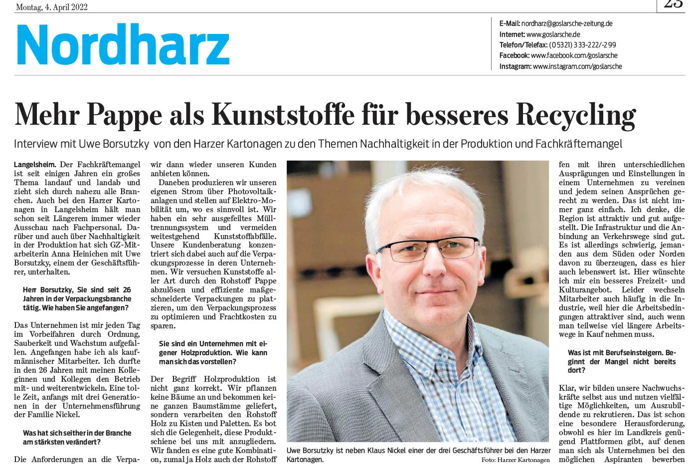 Am 4, April 2022 erschien in der Goslarschen Zeitung ein Interview mit Harzer Kartonagen Geschäftsführer. Uwe Borsutzky, zu den Themen Nachhaltigkeit in der Produktion und Fachkräftemangel. Hier können Sie das von der Tageszeitung zur Verfügung gestellte Interview nachlesen.